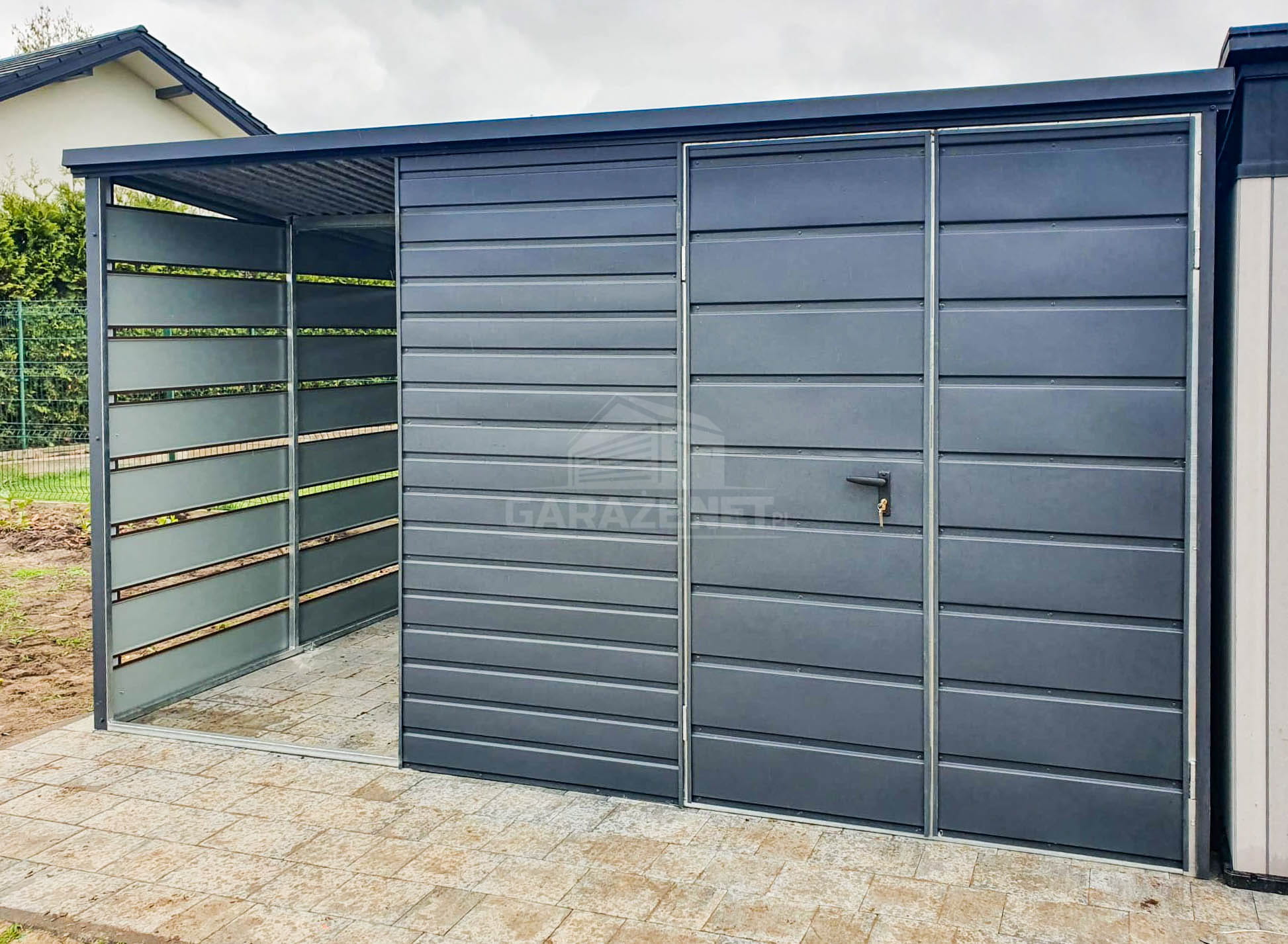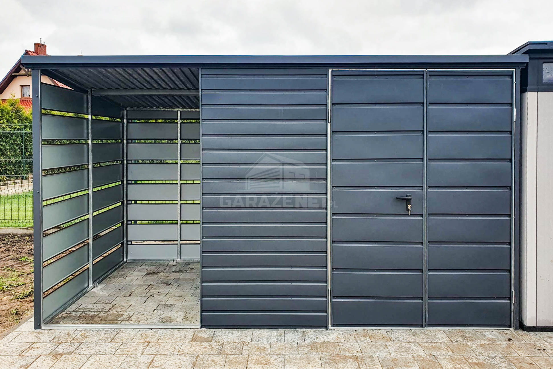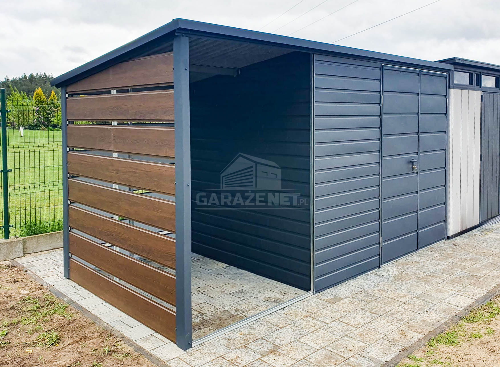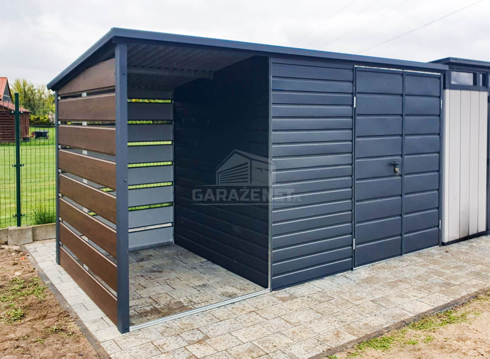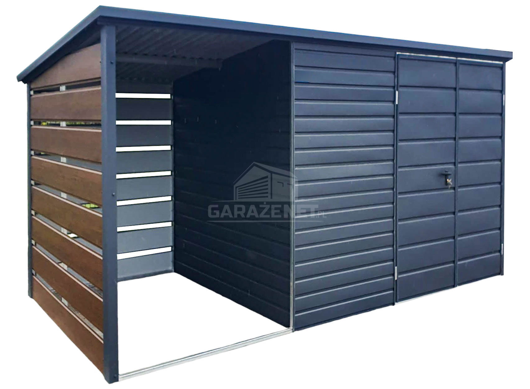 SCHOWEK - DOMEK OGRODOWY 3X2M + WIATA 1,5X2M - BRAMA DWUSKRZYDŁOWA - ANTRACYT - CIEMNY ORZECH - DREWNOPODOBNY - DACH SPAD W TYŁ TS718
