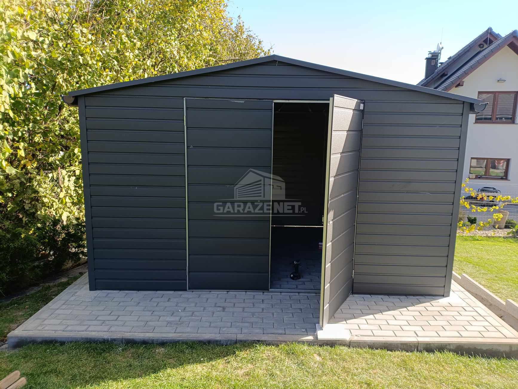 SCHOWEK - DOMEK OGRODOWY 4,5X3,5M BRAMA DWUSKRZYDŁOWA - ANTRACYT - RYNNY - DACH DWUSPADOWY TS848