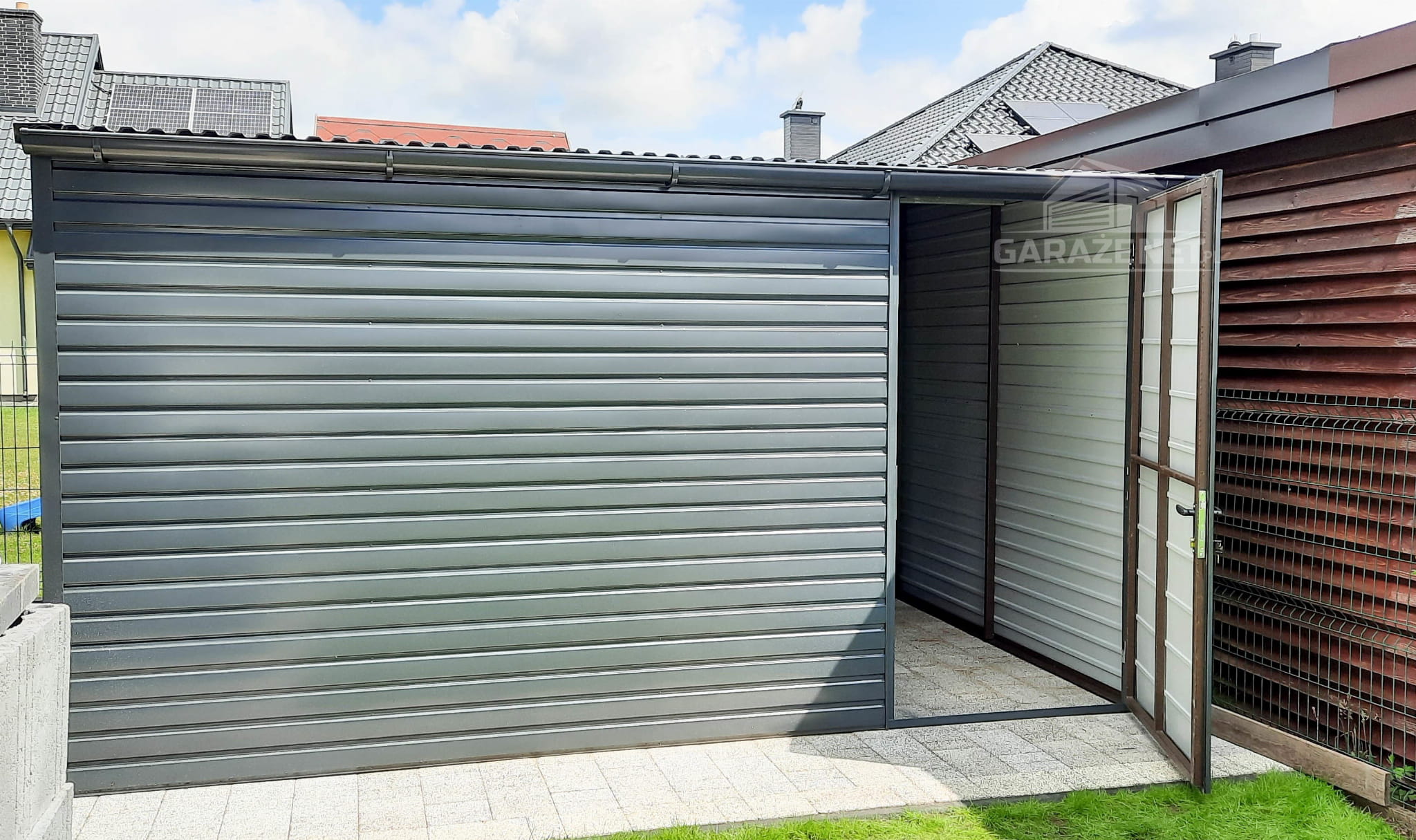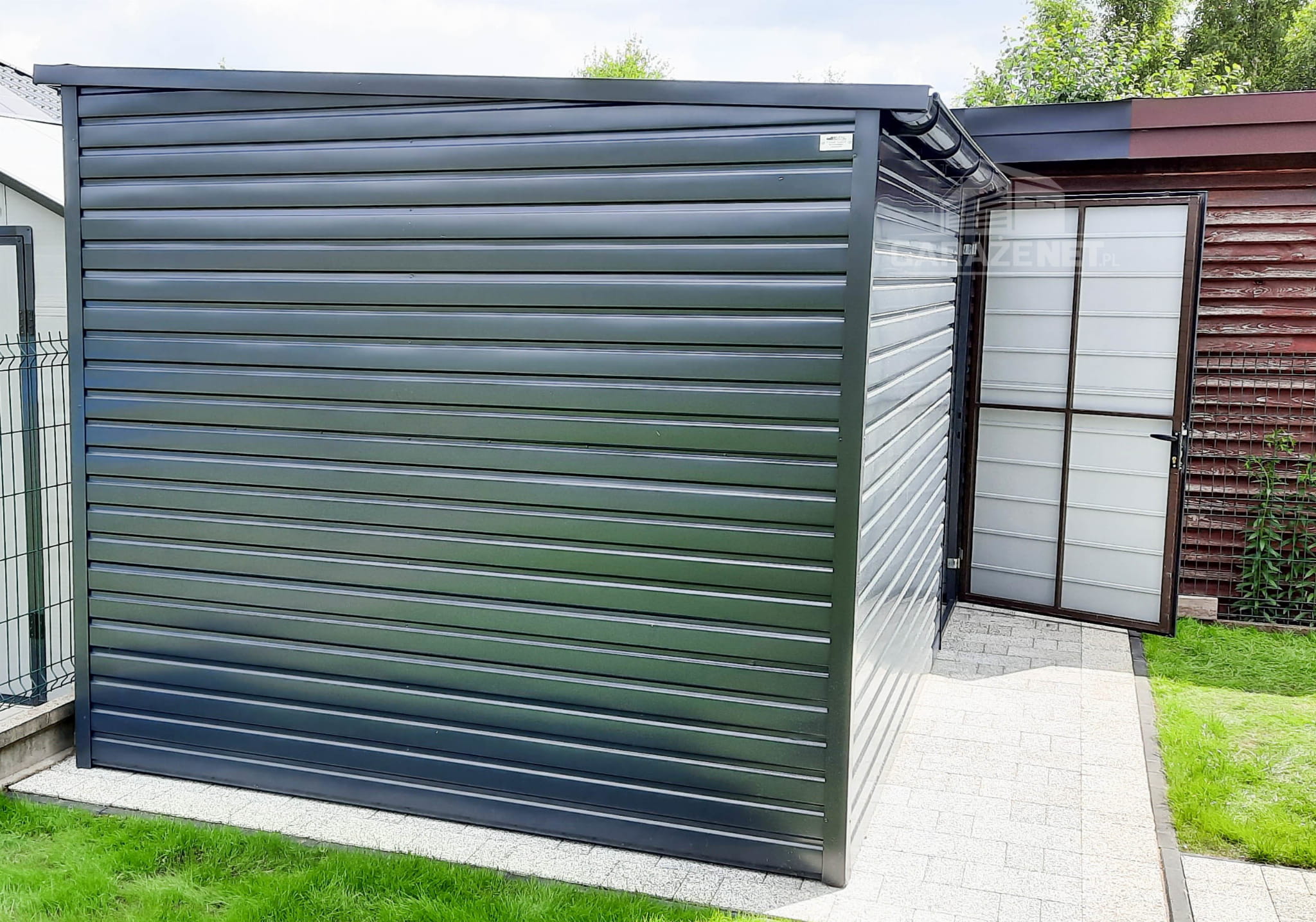 SCHOWEK - DOMEK OGRODOWY 4M X 3M SPAD W PRZÓD - DRZWI RYNNY ANTRACYT TS303 4X3 GB281