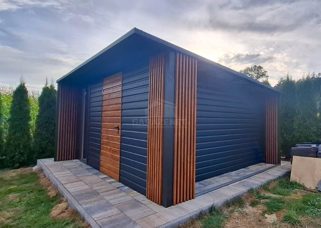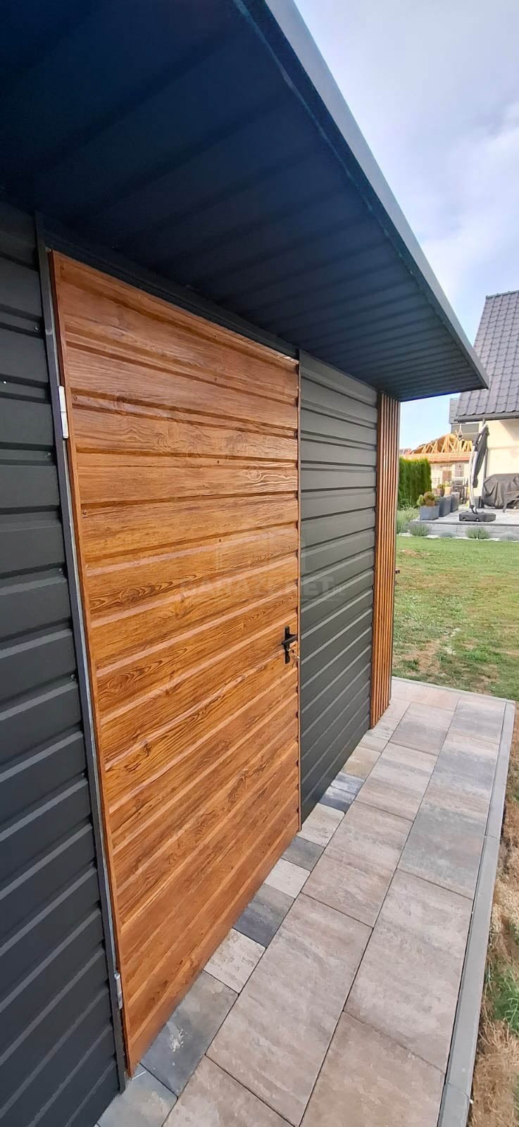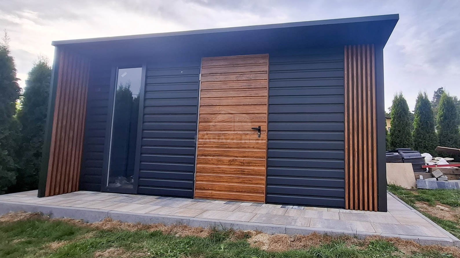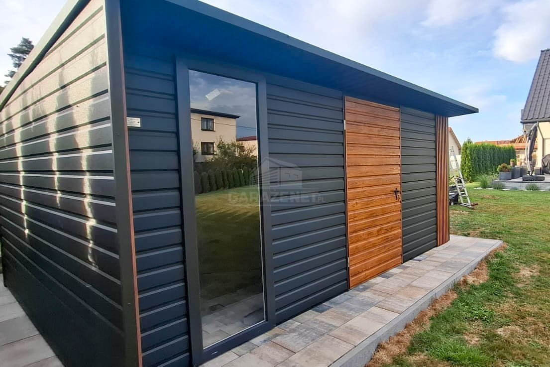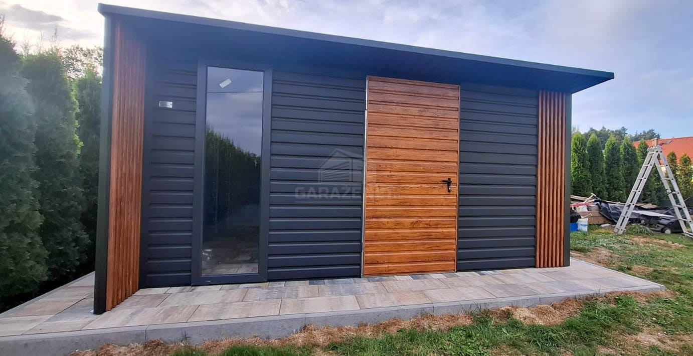 SCHOWEK – DOMEK OGRODOWY 4X4M – DRZWI – OKNO – ANTRACYT – DEKOR Z LAMELI – DACH SPAD W TYŁ TS1185