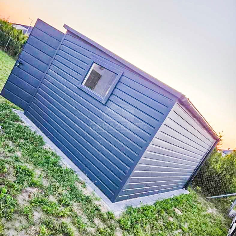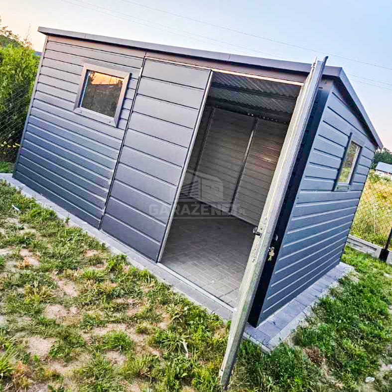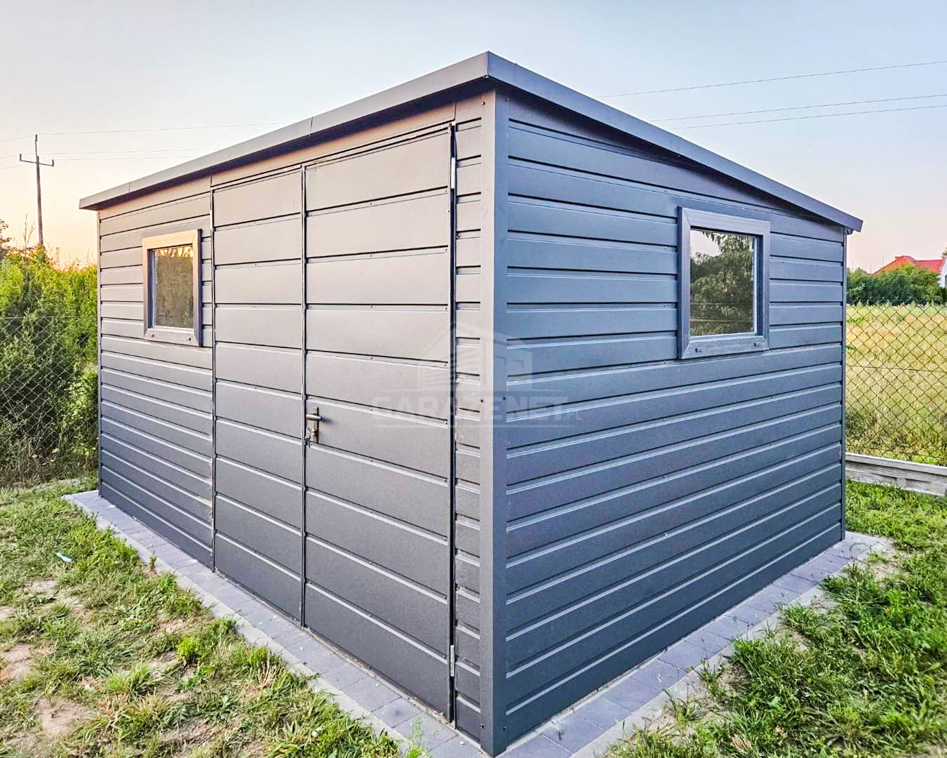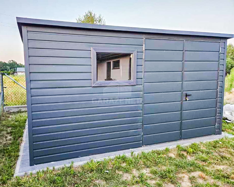 SCHOWEK - DOMEK OGRODOWY 4x3M BRAMA DWUSKRZYDŁOWA 2X OKNO - ANTRACYT - RYNNY - DACH SPAD W TYŁ TS759