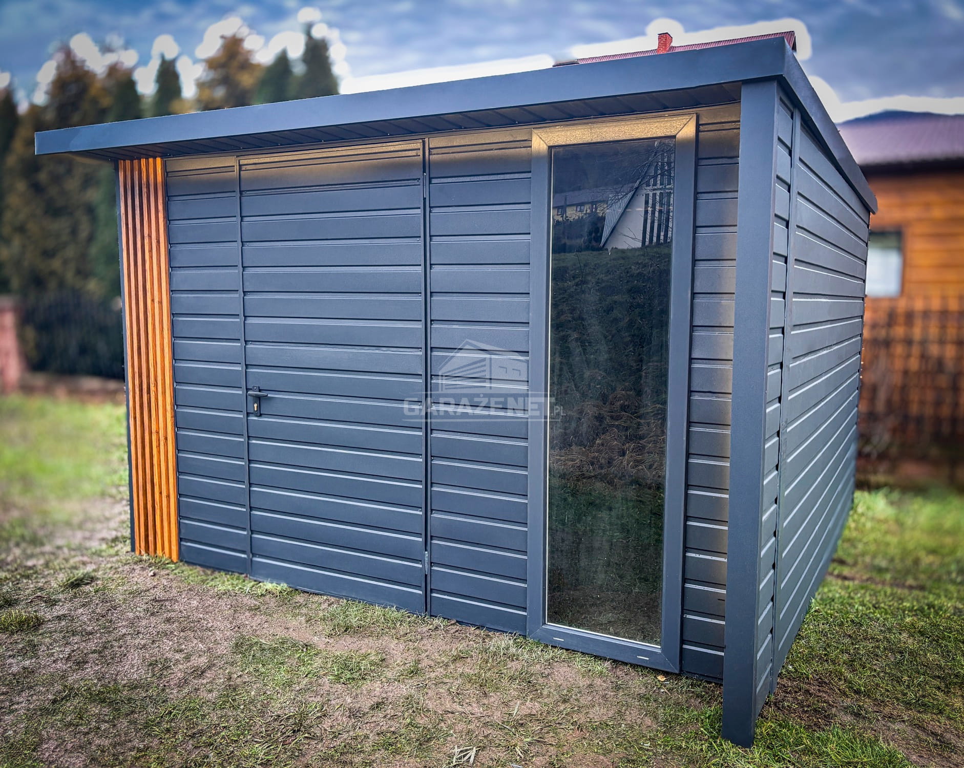 SCHOWEK - DOMEK OGRODOWY PREMIUM 3X3M + WIATA 0,5M - DRZWI - OKNO - DEKOR Z LAMELI - ANTRACYT - DACH SPAD W TYŁ TS990